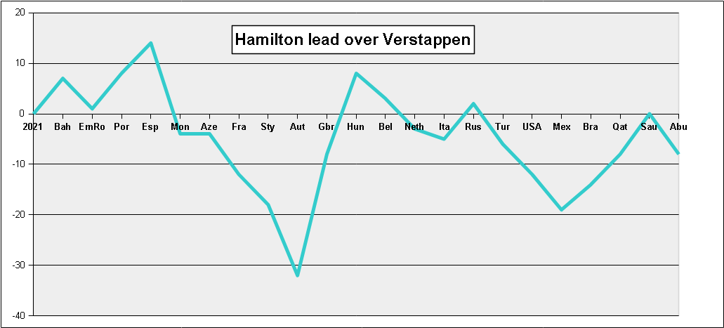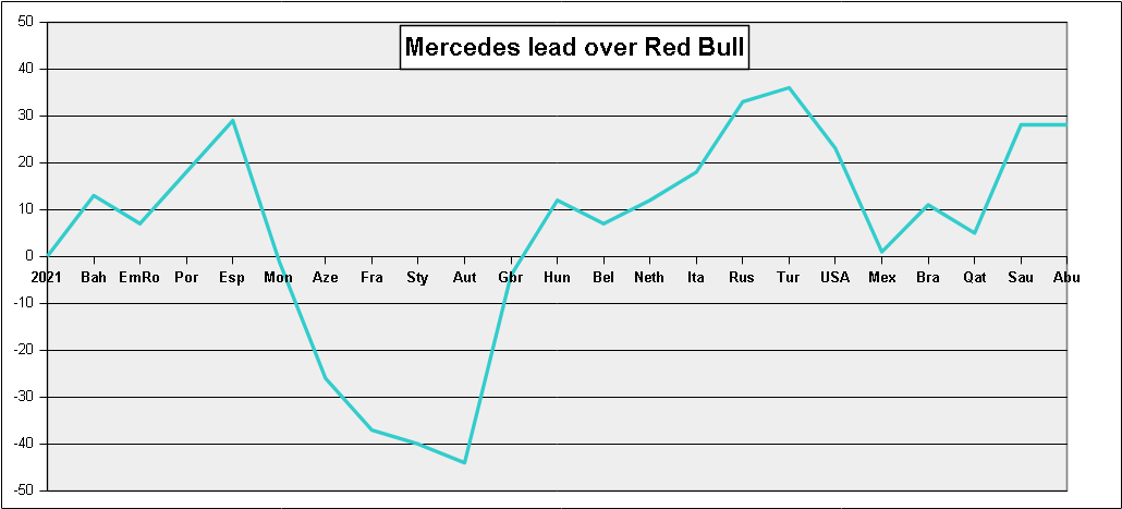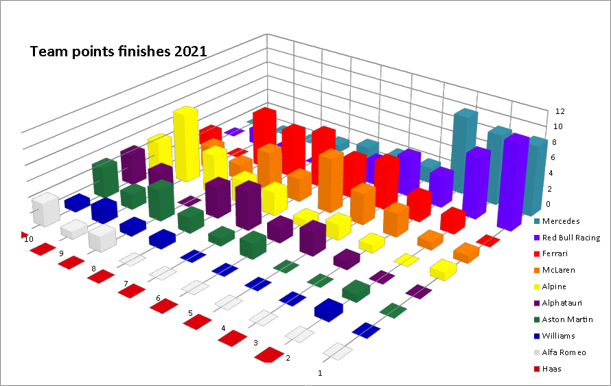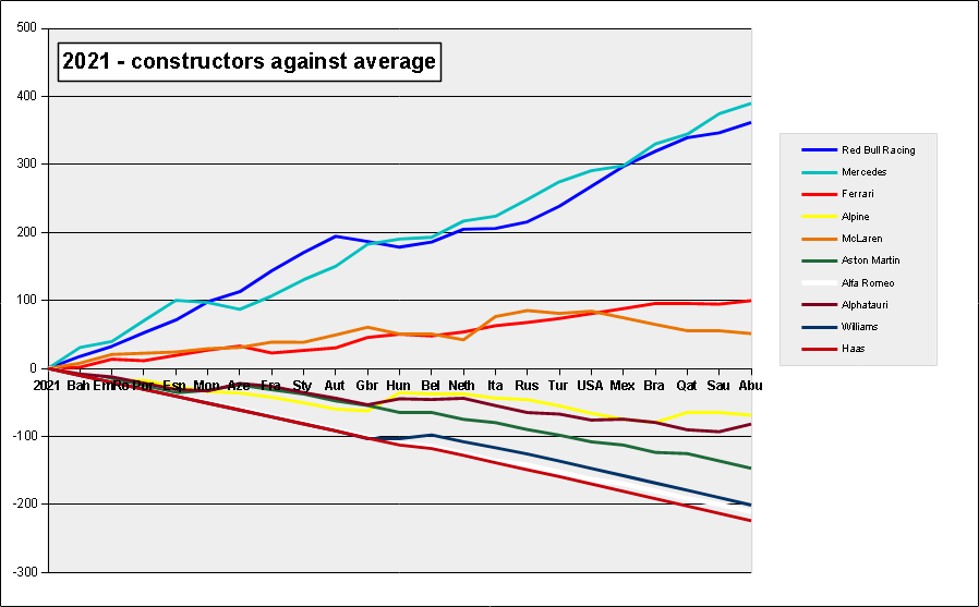 The "average" team scores 10.2 points (but it varies a bit with sprint races, half points races, and fastest lap not always getting a point). Below average teams are on a downward slope