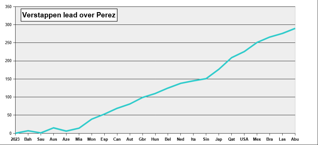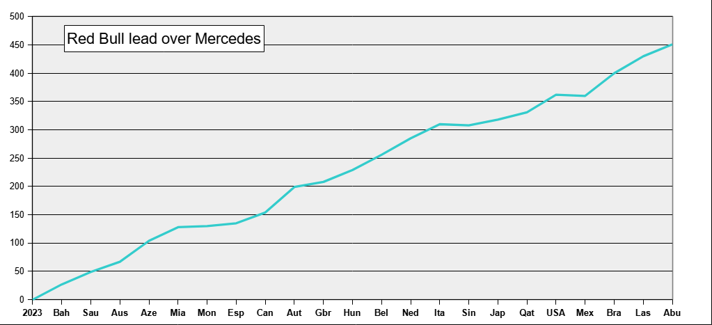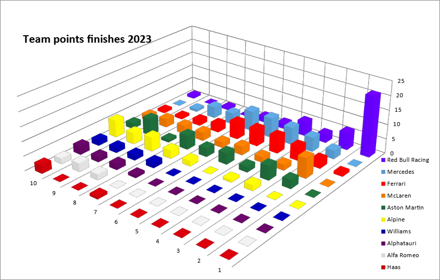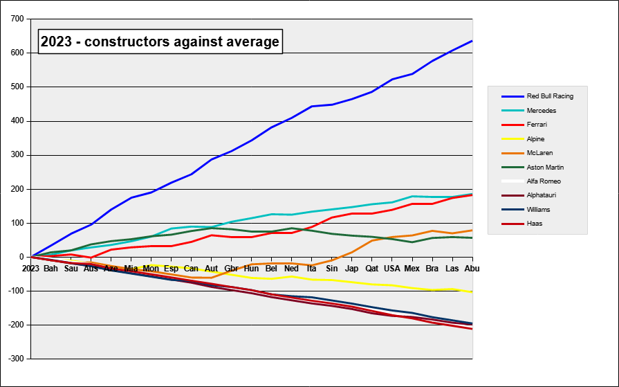 The "average" team scores 10.2 points (but it varies a bit with sprint races, half points races, and fastest lap not always getting a point). Below average teams are on a downward slope.