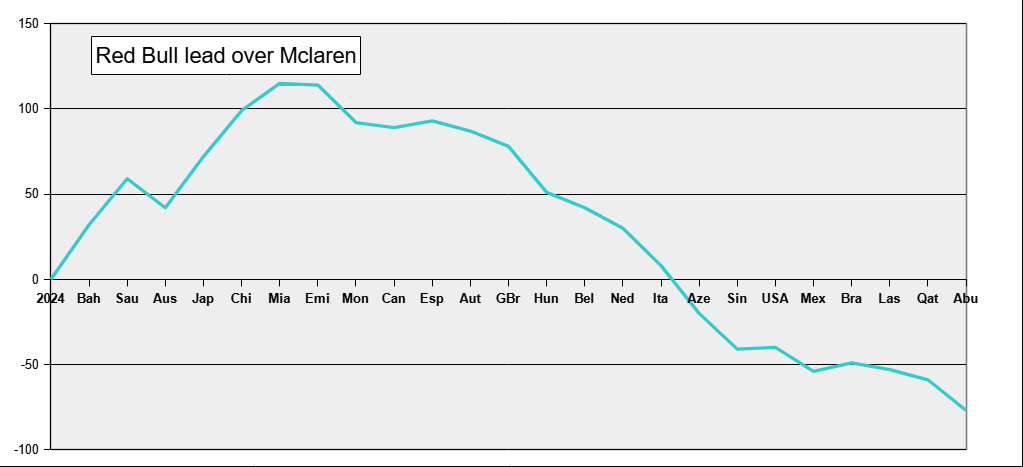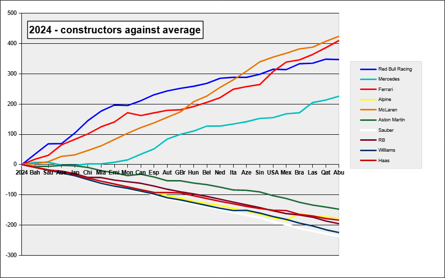 The "average" team scores 10.2 points (but it varies a bit with sprint races, half points races, and fastest lap not always getting a point). Below average teams are on a downward slope.