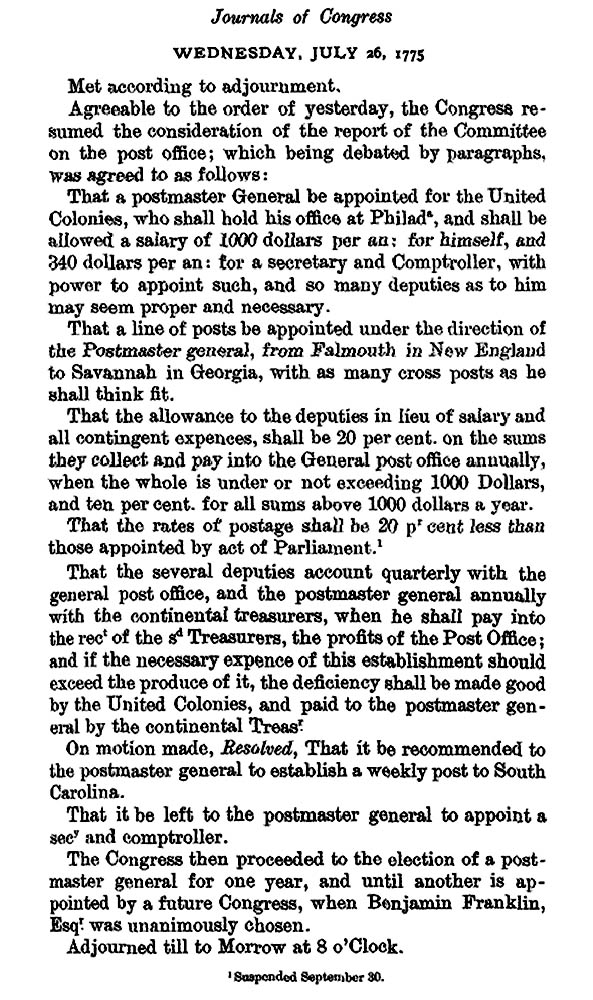 "After the start of the American Revolution, he was appointed postmaster general of the colonies (image). During his tenure in 1775-76 he laid the foundations for the United States postal service. He greatly increased the number of post offices, started a packet mail service to Britain, and introduced the use of stagecoaches to carry the mails" [0].